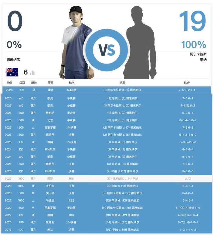 最近的三次,面对00后的三位杰出代表,德米纳尔依旧破门乏术,他只在对阵阿利亚西姆时拿到了八强战中的唯一一盘。