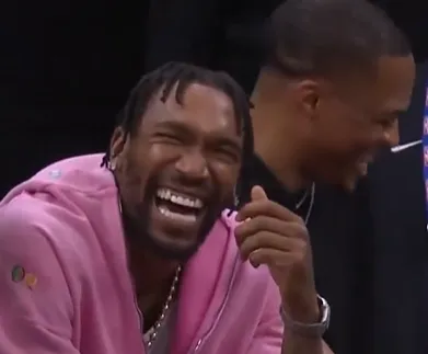 美国篮球媒体Hoop Central晒出比赛中鲍尔三分投进后看向替补席的威斯布鲁克,随后威斯布鲁克在替补席开怀大笑。