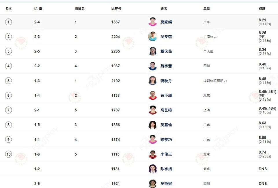 莫家蝶以8秒21的成绩获得了冠军,吴安琪8秒25获得亚军,获得季军的是跑出8秒34的戴仪茹。